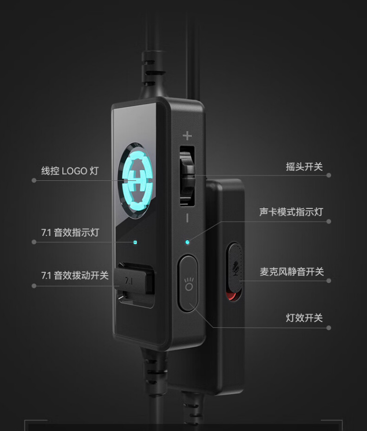 G2Pro采用双声卡设计,简单来说就是麦克风音量和耳机游戏音量可以独立调节。同时耳机本身调节音量,也与Windows系统的音量是分开的。G2Pro还为玩家设计了一个非常好的集成耳机控制器。静音、7.1环绕声和灯光均为机械开关,方便玩家在游戏过程中调整耳机。